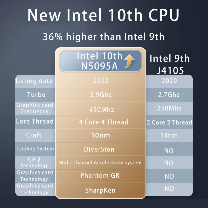 Brand: Fedemer Model:Fedemer-N5095A OS: WIN10 /WIN11 CPU: Intel Celeron Processor N5095A Core: 4 Cores 4 Threads, 2.0GHz-2.9GHz GPU: Intel UHD Graphics 600, 650MHz |
