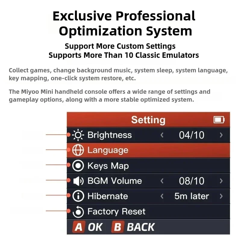 • Support Games: Support ARCADE,ATARI2600,ATARI7800,FC,GB,GBA,MAME2003PLUS,MAME2010,MD